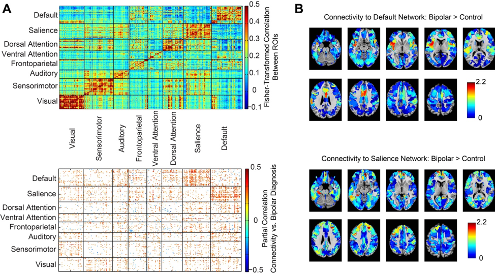 Although pediatric bipolar disorder is among the most disabling psychiatric conditions affecting youths, little is known about how brain connections may be altered. In studying brain images of 80 youths (32 with bipolar disorder, 48 healthy control), we found participants with bipolar disorder showed abnormal development during adolescence of negative or inhibitory connections between two important brain networks that regulate attention to the outside world vs. one’s internal thoughts and narrative. We find that such negative connections comprise the most abnormal brain connections in pediatric bipolar disorder, and that delayed or abnormal development of such negative connections may be a core feature of how bipolar disorder forms in the brain. These abnormal connections are concentrated between 2 brain networks: the default mode and salience network. You can read the full story here: